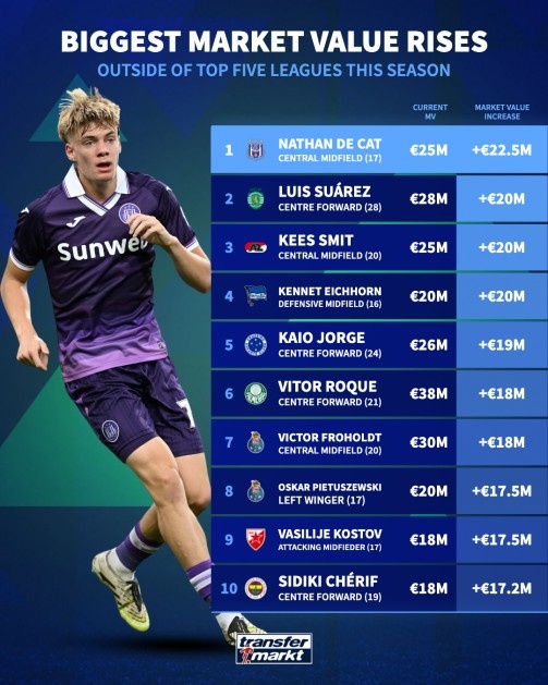 爱游戏体育-本赛季五大联赛外球员身价涨幅榜:德卡特+2250万欧居首
